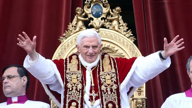 That’s how, today, I’ll research one aura part — one chakra databank — at a time. Exploring the inner spirituality of Pope Benedict XVI when he announced his extraordinary retirement on February 28, 2013. This is the newspaper article I’ll use to introduce you to the resigning pope. It includes this photo of Pope Benedict.